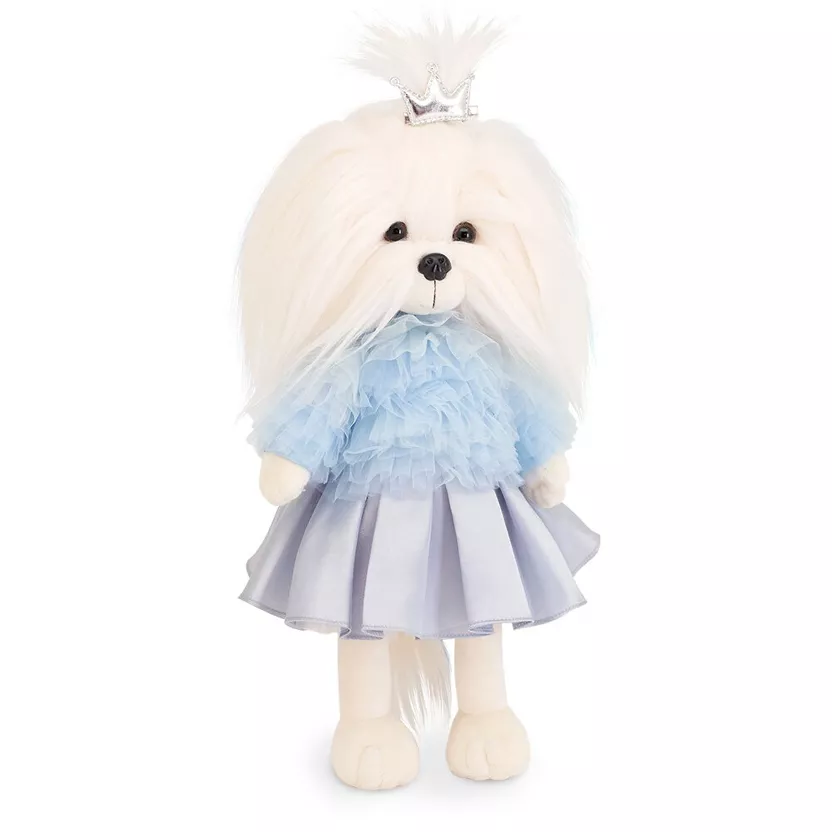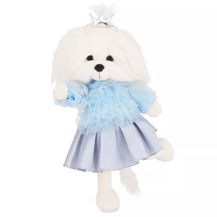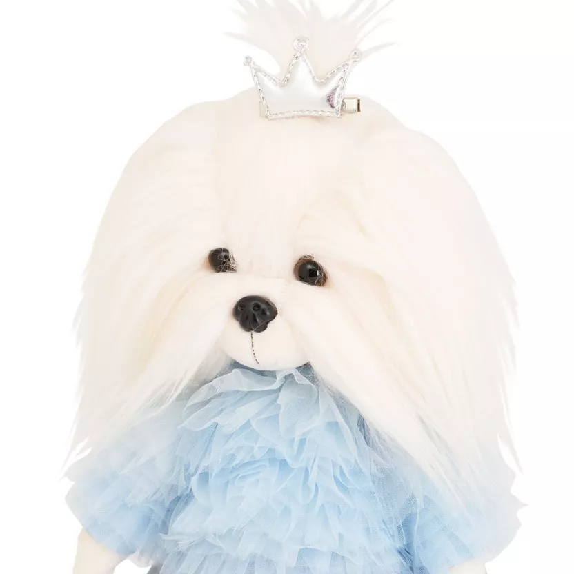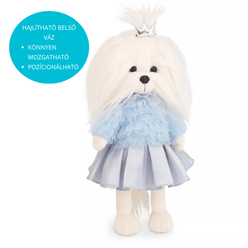 Lucky Mimi egy 38 cm magas, elegáns megjelenésű plüss kutya, amely finom részleteivel és különleges stílusával azonnal magára vonja a figyelmet. Hosszú, selymes bundája és gondosan formázott megjelenése kifinomult összhatást kelt, amelyet az apró, korona formájú csat tesz igazán különlegessé. A légies felső és az ezüstösen csillogó szoknya könnyed, mégis látványos megjelenést biztosít.