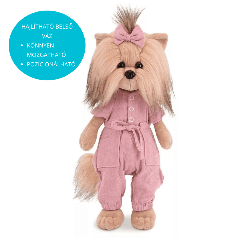 Lucky Yoyo egy 38 cm magas, stílusos plüss kutya, amely puha tapintásával és egyedi megjelenésével hamar a gyerekek kedvencévé válik. Hosszú, selymes bundája és karakteres frizurája különleges megjelenést ad neki, amelyet a rózsaszín, finoman kidolgozott ruha tesz igazán egyedivé. A megkötős derék, az apró gombok és a harmonikus színvilág elegáns, mégis játékos összhatást biztosítanak.