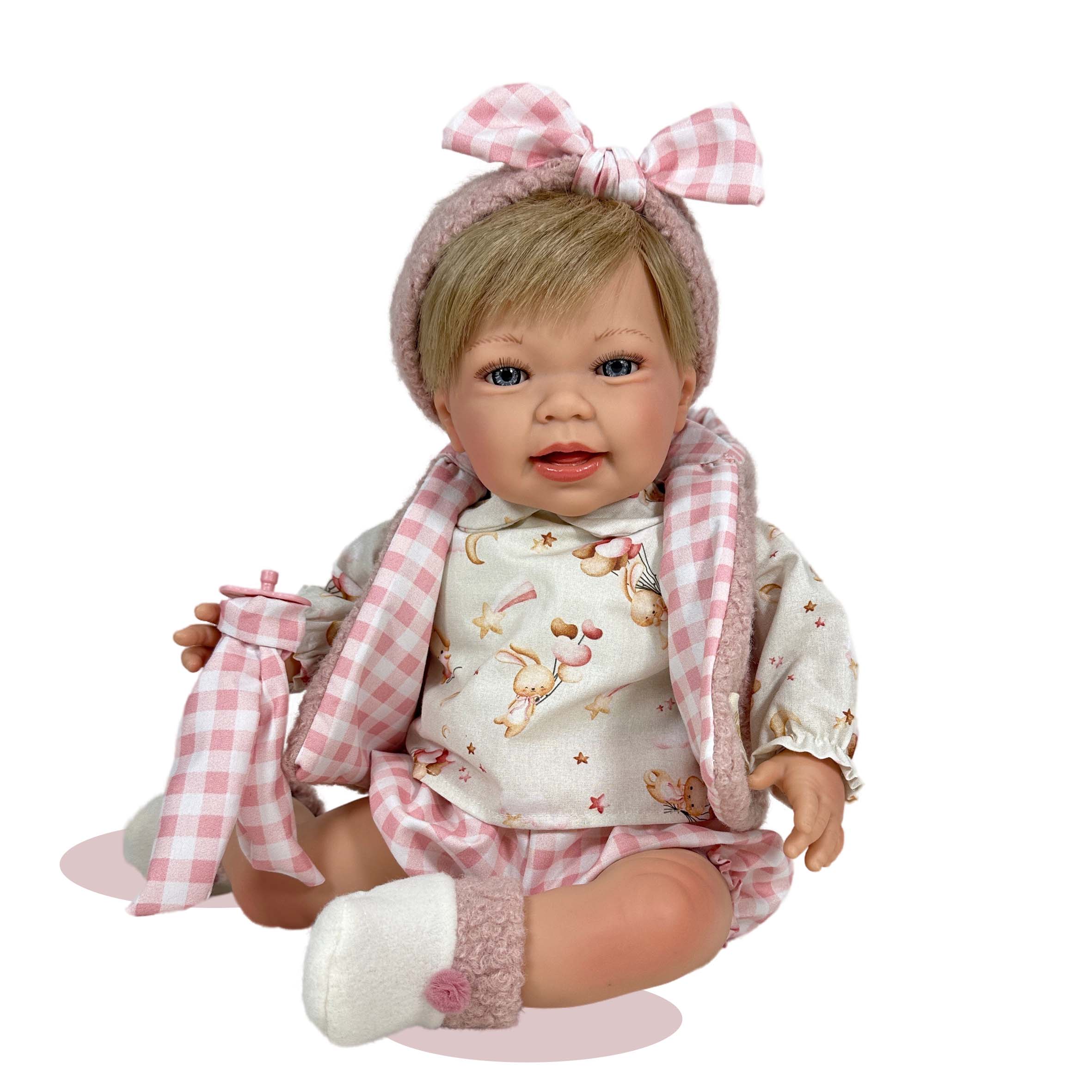 Panni egy 48 cm magas, részletgazdagon kidolgozott prémium játékbaba, puha testtel és finoman formált vinyl végtagokkal. Arcának kidolgozása, kék szemei és enyhén piros pozsgás arca különösen életszerű megjelenést adnak neki. A baba egy bájos, pasztell rózsaszín árnyalatú szettben látható, amely tökéletesen harmonizál egymással. A ruhán finom, apró minták – kis állatkák és csillagok – díszítik a felsőt, ami játékos és kedves megjelenést kölcsönöz. A szettet kockás mintájú, rózsaszín-fehér kiegészítők egészítik ki, mint a fejpánt masnival és a hozzá illő kendő. Az öltözéket puha anyagú kis zokni teszi teljessé, amely tovább fokozza a baba komfortos és szerethető összhatását. Megjelenése harmonikus, letisztult és kifejezetten kedves hangulatú. Puha testének köszönhetően Panni könnyen ölbe vehető, szeretgethető, így ideális társ a mindennapi játékhoz,