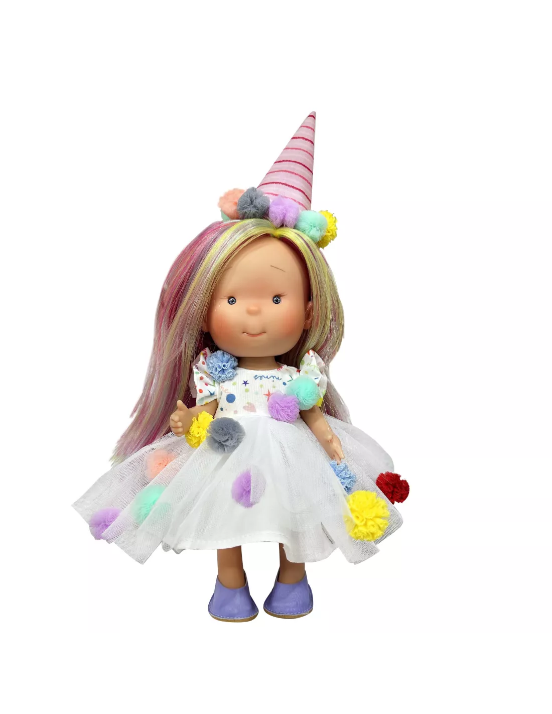 Pippa egy divatos, vidám szoknyát visel, amelyet színes pomponok tesznek még játékosabbá, felsője pedig tökéletesen harmonizál az összeállítással. Megjelenését elegáns cipő egészíti ki, amely még stílusosabbá varázsolja ezt a különleges babát.