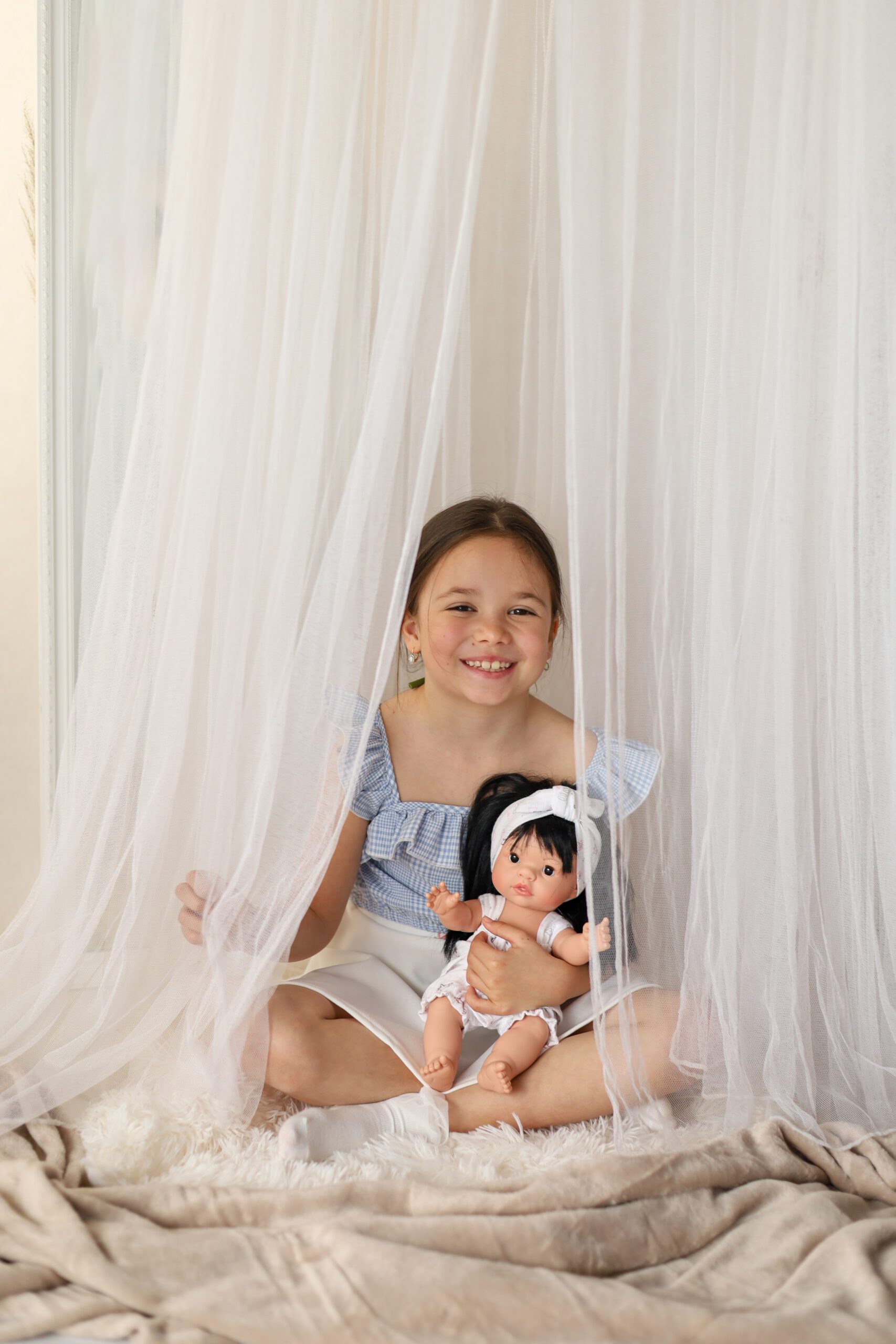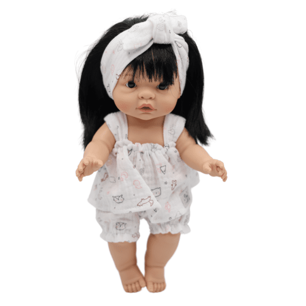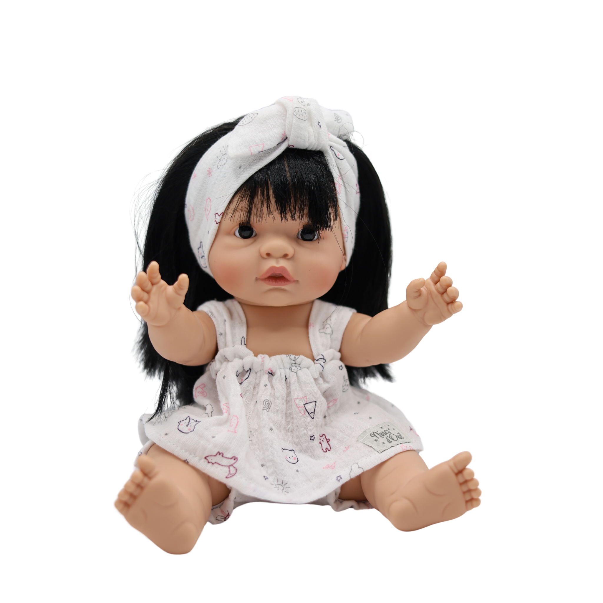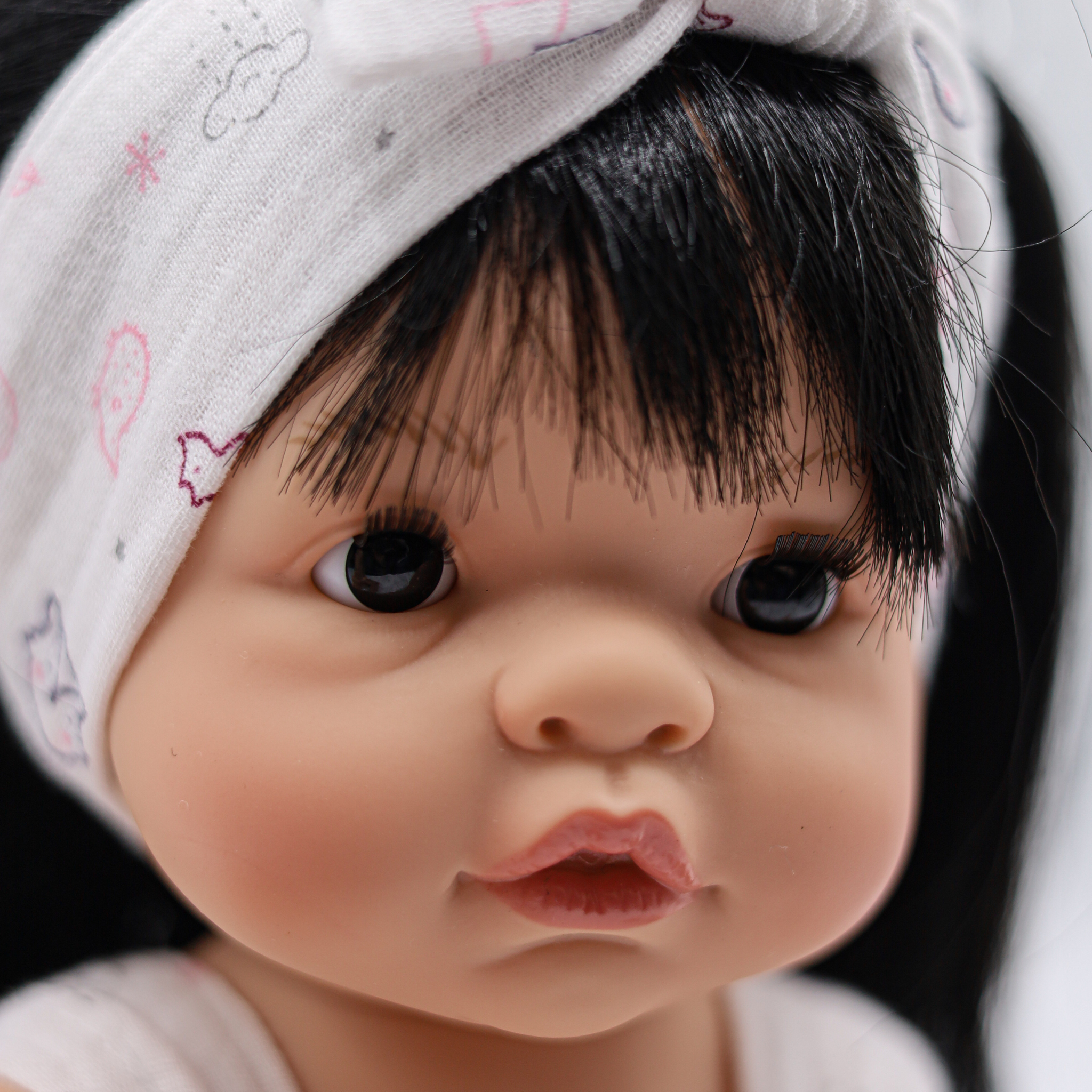 Ő itt Zoé a 37 cm magas, vanília illatú, vinyl testű élethű játék baba. A baba hosszú, fekete haja divatos frufruval van díszítve, amit egy gyönyörű állatmintás ruha hajpánt tesz még különlegesebbé. A fehér alapon állatmintás nadrágja és a hozzá passzoló ruhája egyedi stílust kölcsönöz a babának, garantálva, hogy a kicsik szívét azonnal elrabolja. Minden részletnél a gondos tervezés és a minőségi kivitelezés látszik, így a baba valódi élethűséget sugároz. Zoé fekete szemei és hosszú szempillái csak fokozzák a bájosságát. A baba testét vinyl anyagból készítették, amely vízálló, így ideális fürdetéshez is, így a gyermek tovább élvezheti a játékot a fürdőkádban is.